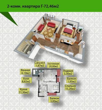 Продаю 2-комнатную квартиру, 72,46кв. м., этаж - 4/9, Город Ош микрорайон Анар улица Абдыкадырова 2017/1.