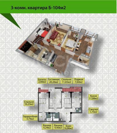 Продаю 3-комнатную квартиру, 104кв. м., этаж - 3/9, Город Ош микрорайон Анар улица Абдыкадырова 2017/1.