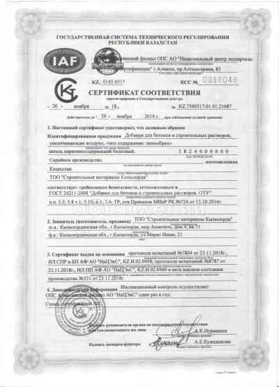 Пенообразователь белковый имеет Сертификат соответствия выданный Алматинским филиалом АО «Национальный центр экспертизы и сертификации» KZ.О.02.0317 КСС№0012048 от 26 ноября 2018 г., зарегистрирован в Государственном реестре за №KZ.7500317.01.01.21687, Код ТН ВЭД ЕАЭС 3824400000, ГОСТ 24211-2008 «Добавки для бетонов и строительных растворов. ОТУ»