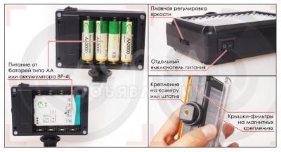 аккумулятор в комплекте!!! Ft-96 это легкий, компактный, энергоэффективный светильник. он идеально подходит для dslr камер. расположение светодиодов на матрице оптимально подходит для съемки в формате 16х9. питание осуществляется от 4 батареек или 4 аккумуляторов типа аа или аккумулятора типа bp-4l. время работы от одного комплекта батарей около двух часов. так же возможно питание от powrbank'а и от сети 220v/