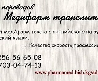 Переводим тексты медицинской, фармацевтической тематики с английского на русский и кыргызский языки. Цены очень низкие, намного ниже чем в других агенствах переводов. Всего 170сом за страницу (1600символов, это 1 страница). Зато качество очень высокое, т.к. переводчики с медицинским и фармацевтическим образованием. Текст заверяется печатью и штампом. Приглашаю к сотрудничеству фармацевтические компании и другие медицинские организации. Переводим досье к регистрации лекарственных препаратов, инструкции к применению, брошюры, научные статьи, документы любого содержания и все, все, все. Работаем быстро и качественно. На рынке переводов с 2013года! Нами переведены сотни досье к регистрации лекарственных препаратов и других документов. Добропожаловать дорогой заказчик! Контакты указаны в визитке ниже. С уважением администрация бюро переводов Медифарм! С нами Вы успеете везде!