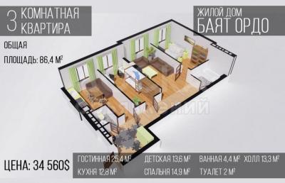 3 ком. кв. - 32 800 долл. США по курсу НБ КР за 1 кв.м.