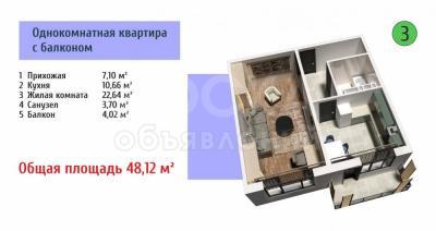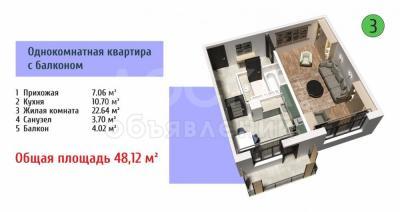Продаю 1-комнатную квартиру, 48кв. м., этаж - 3/9, Юж. магистраль-Токтоналиева.