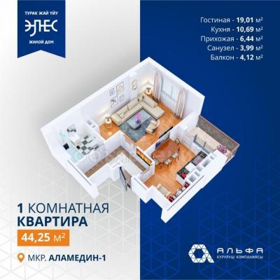 Продаю 1-комнатную квартиру, 44.25кв. м., этаж - 4/9, мкрн аламедин 1.