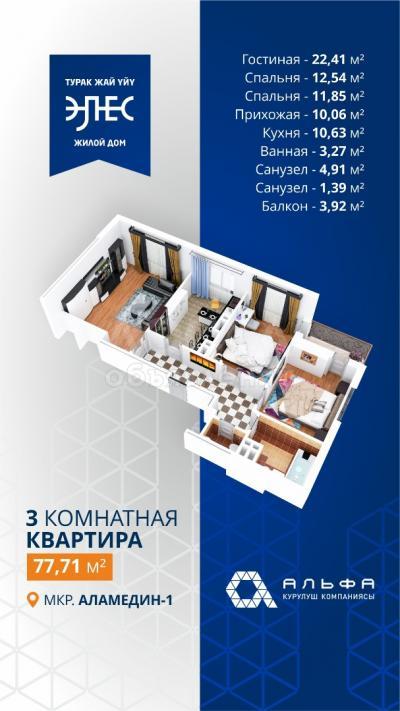 Продаю 3-комнатную квартиру, 78кв. м., этаж - 9/9, мкрн аламедин 1.