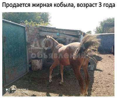 3. Продается жирная кобыла, возраст 3 года. Цена договорная. Адрес: Сокулукский район, село Студенческое, улица Юбилейная, дом 6, квартира 1.