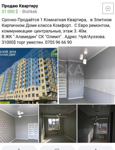 Срочно Продаётся Квартира 1Комнатная Квартира в Элитном Кирпичном Доме, этаж 3,. 40м, коммуникации центральные, тех паспорт есть, В Жилом Комплексе "Аламедин" СК "Олимп" Чуй Ауэзова. 31000$ торг уместен 0705966690