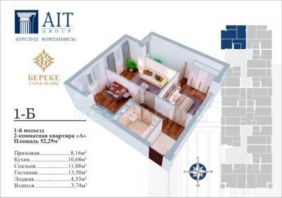 Продаю 2-комнатную квартиру, 52,29кв. м., этаж - 3/9, На пер. ул. Фучика/Рыскулова ориентир (Шлагбаум).