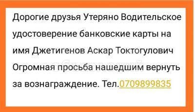 Дорогие друзья утеряно водительское удостоверение на мое имя. Огромная просьба нашедшим вернуть за вознаграждение! 0709899835 звоните