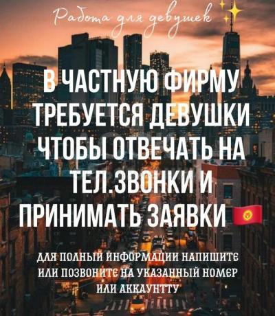 внимание открыть набор сотрудников в рекламное агентство, работа постоянно.график 10:00-18:00 суббота и воскресенье выходной, достойная оплата.от вас: знание кыргызкого языка, наличие ПК или ноутбук.обращайтесь по Вацап