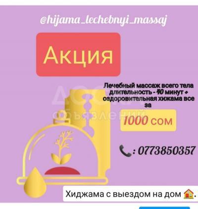 Сөзсүз хиджама жасоодон мурун ваакумный, вибрационный массаж жасоо менен аялдар учун хиджама жасайбыз. Хижама – бул ар кандай ооруларды, кан чыгаруу жолу менен дарылоонун бирден-бир байыркы ыкмасы организмден бузулган канды чыгаруу жолу менен, көптөгөн оорулардан арылса болот.
