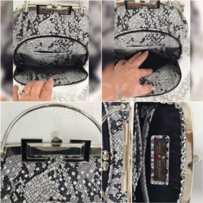 Эта сумочка сшита из галантерейной кожи черно-белого цвета с тиснением ‘под крокодила’.