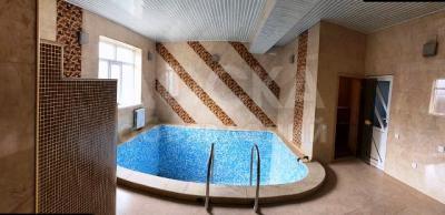 Баня из натурального дерева, большая комната отдыха с камином, большой бассейн, парилка, санузел. Во дворе зеленые насаждения. Двор выложен плиткой.