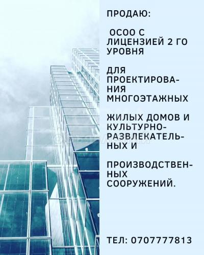 Продаю ОсОО с Лицензией 2 го уровня, для проектирования многоэтажных жилых домов и культурно- развлекательных и производственных сооружений. Цена договорная. Тел: 0707777813
