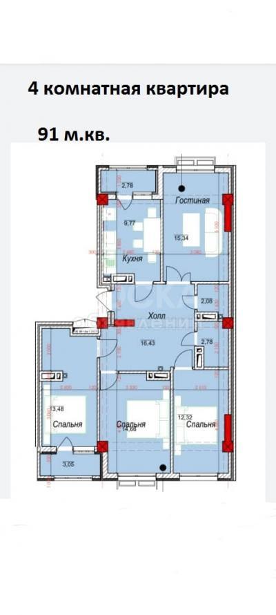Общая площадь 91м2