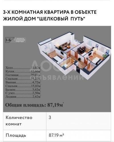 Продаю 3-комнатную квартиру, 87кв. м., этаж - 6/9, Жибек Жолу/Суюмбаева.