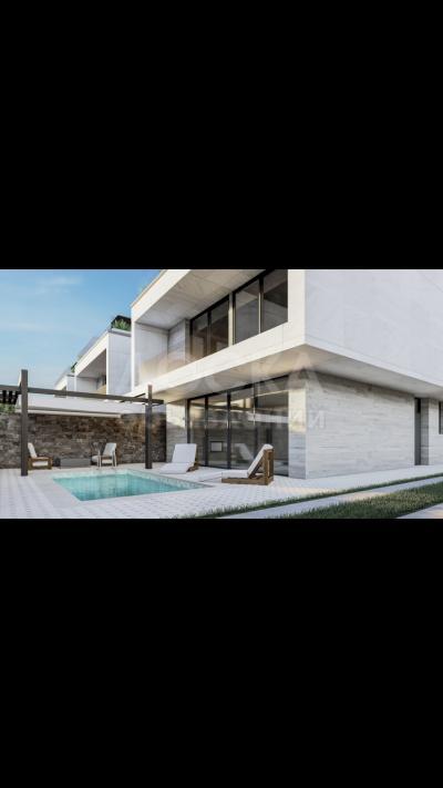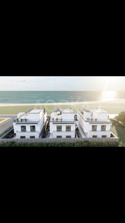 Общая площадь одной виллы 208 м2. Фасад в стиле модерн, в светлых тонах керамогранита. Витражные окна открывают панорамный вид на озеро Иссык-Куль.