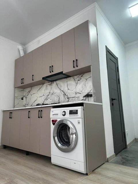 Имеются стиральная машина, холодильник, кухонный гарнитур, газплита, вытяжка, водонагреватель.
