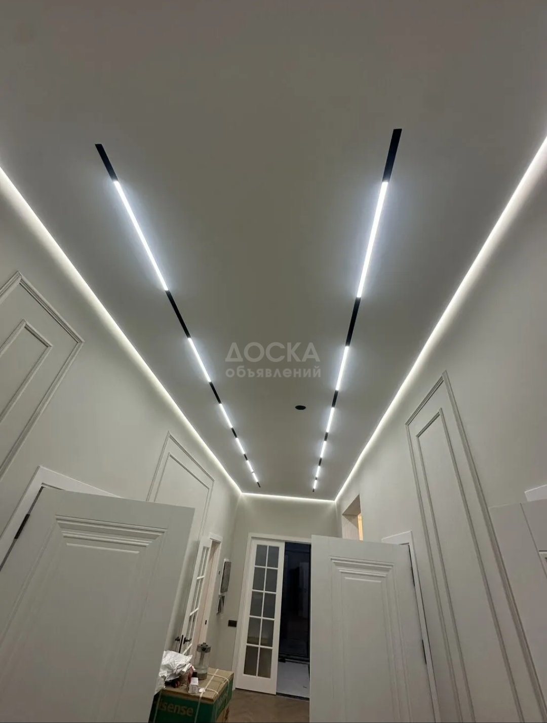 - Монтаж в помещениях любой сложности: комнаты, коридоры, санузлы (влагоустойчивые решения), ниши, многоуровневые участки.