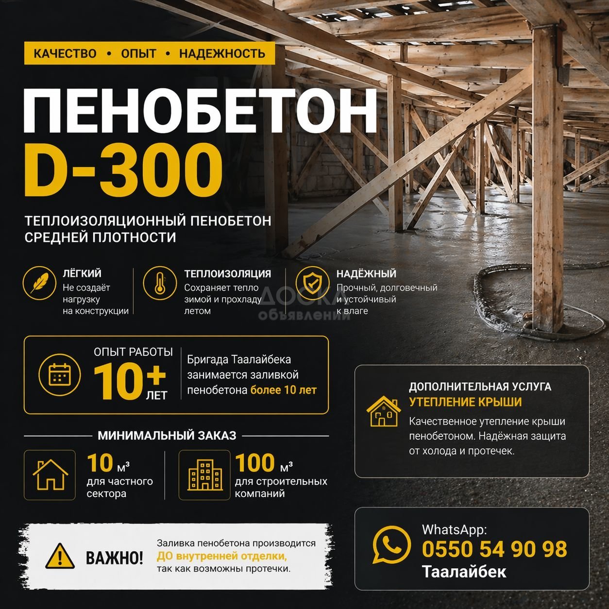 Бригада Таалайбека занимается услугами заливки пенобетона на крышу и утепление крыши в течение длительного времени более 10 лет.