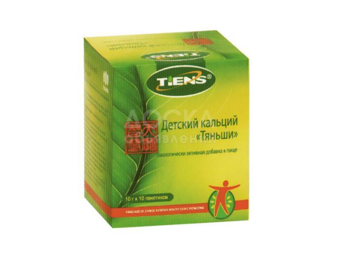 Форма выпуска кальция Тяньши: 10 пакетов по 10 грамм в упаковке.