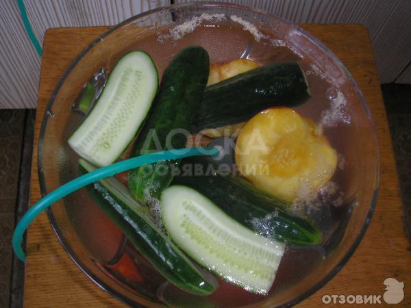 Включите прибор в сеть, положите фрукты и овощи ( не более 5 кг), нуждающиеся в обработке, в воду. Поместите на дно емкости, наполненной водой, насадку шарообразной формы, оставьте прибор включенным на 3-10 минут. Птица, мясо и другие продукты очищаются в течение 10-20 минут.