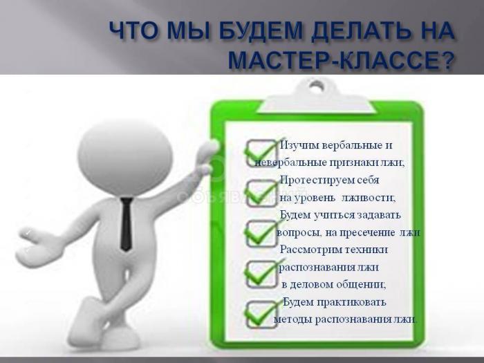 Порой мы оказываемся в круговороте лжи, в котором сложно определить, что - правда, а что – нет. Многие из Вас будут крайне удивлены, но в среднем человеку лгут примерно 200 раз (!) в день. В большинстве случаев очень сложно отличить правду от вымысла. Конечно, стать «детектором лжи» - непростая задача, но мы поможем Вам освоить основные инструменты распознавания лжи. Почему лжем мы, и почему лгут нам? Что движет человеком, когда он лжет? Как вести себя в ситуациях обмана? В ходе мастер-класса вы получите ответы на эти и многие другие интересующие Вас вопросы. Методики распознавания лжи – это первоклассная защита, вселяющая в Вас уверенность в общении.