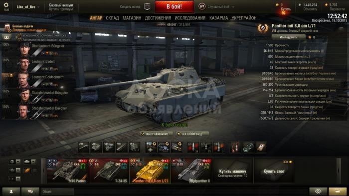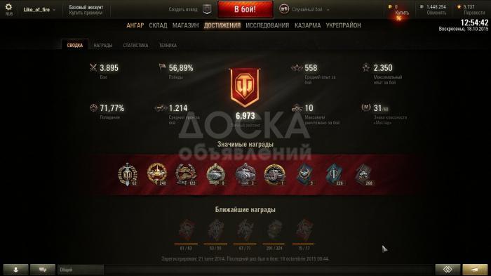 Продаю аккаунт WoT. Ник Like_of_fire. 4000 боёв 57% побед. РЭ 1374.WN8 2185. WN6 1628. WGR 6973.