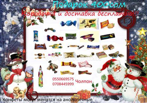 Новый Год это волшебный праздник, когда сбываются все мечты! Подарите сладкий подарок Вашим детям! Мы предлагаем ассортимент подарков на сумму от 500сом и ниже. Оптовым покупателям бонусы!