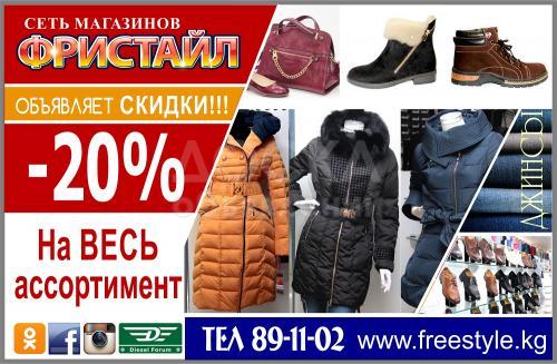 СКИДКИ 20% на весь ассортимент товара в магазинах ФРИСТАЙЛ! Покупайте джинсы , куртки , пуховики , женскую и мужскую зимнюю обувь и многое другое со скидкой 20 % в магазинах ФРИСТАЙЛ . Телефон 89-11-02 www.freestyle.kg