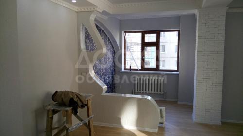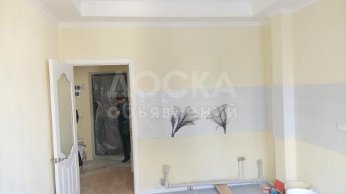 Стены - декоративная штукатурка, потолки - натяжные + гипсокартон, пол - ламинат. Санузел - кафель, установлена ванна, унитаз, раковина. Кухня: рабочая стена - кафель, есть декор в виде исскуственного кирпича, пол - пополам кафель и ламинат. Батареи - чугунные, белорусские, в зале - 2 шт. по 10 секций, в кухне - 1 шт. по 10 секций.