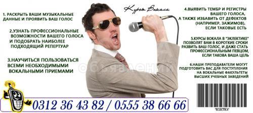 При необходимости наши преподаватели могут подготовить вас для поступления на вокальные факультеты высших учебных заведений. Первое занятие вокалом на этом курсе, как и на остальных, проводится бесплатно. О том, как проходят уроки в нашей школе,и стоимость обучения можно подробнее узнать позвонив нам! Наши администраторы с удовольствием проконсультируют Вас и расскажут о наших курсах! Тел.: 0555 38 66 66 / 0700 767 737 / 0312 36 43 82
