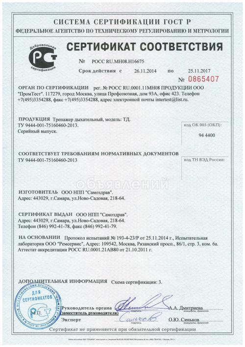 - Дыхательный тренажер имеет регистрационное удостоверение на медицинское изделие, выданное Федеральной службой по надзору в сфере здравоохранения.