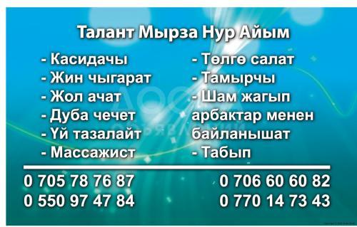 Касидачы - дем салып ар кандай оорууларды айыктырат. Илешкен жин-шайтандарды, каргыш , кара дубаны , коз тийгенди окуп чыгарат.