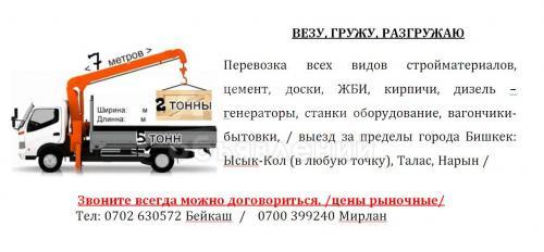 Перевозка всех видов стройматериалов, цемент, доски, ЖБИ, кирпичи, дизель –генераторы, станки оборудование, вагончики- бытовки, / выезд за пределы города Бишкек: Ысык-Кол (в любую точку), Талас, Нарын /