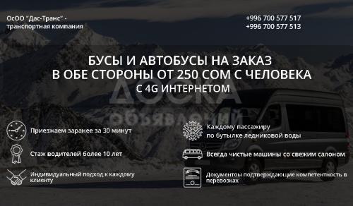 ОсОО "Дас-Транс" - предоставляет свои услуги по осуществлению перевозки пассажиров автобусами и микроавтобусами на наиболее выгодных условиях по всему Кыргызстану более 15 лет.