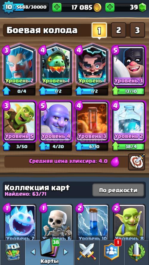 10 уровень , 3 легендарные карты , все эпические , редкие , обычные карты , топ клан