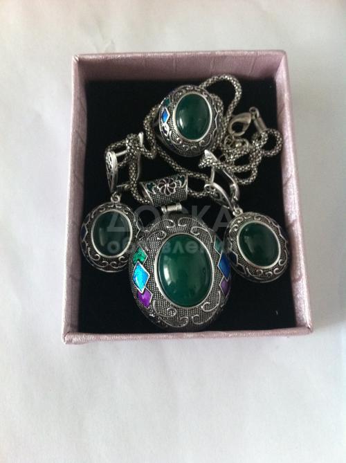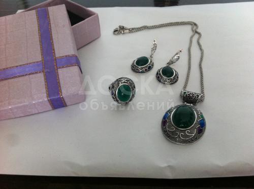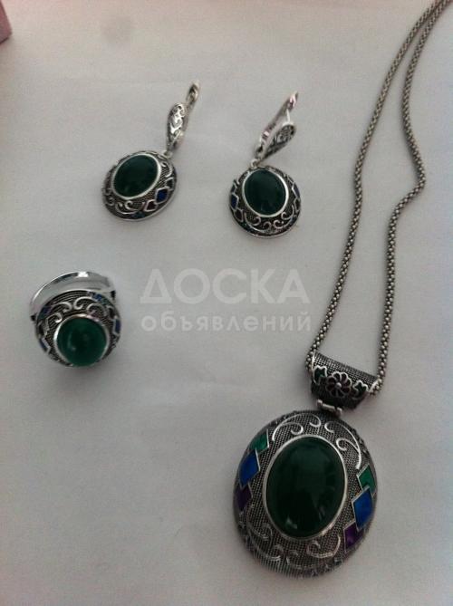 Малазийское серебро 925 пробы: серьги, кольцо 18 размер, цепочка и кулон. Искусственно выращенный нефрит.