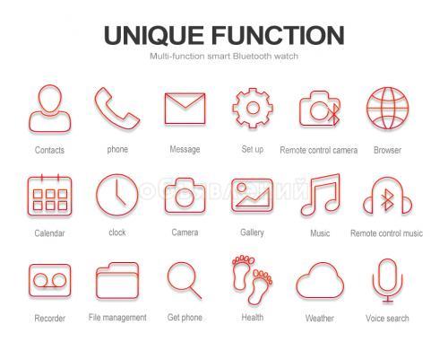 Функции: Звонки,Календарь,Неделя,Пульт дистанционного управления,уведомления,Reminder,Sleep Tracker,Сердечного ритма трекер,Call Reminder,Fitness Tracker