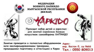 Федерация Боевого Хапкидо Кыргызской Республики (WHMAF) проводит набор детей и взрослых для занятий корейским боевым искусством самообороны ХАПКИДО, разделы которого включают ударную технику рук и ног, борьбу, работу с оружием, спец. технику и многое другое. Занятия проводятся в полностью оборудованном зале квалифицированными тренерами прошедшими подготовку и аттестацию в Корее.