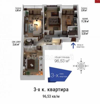 Общая площадь квартиры состовляет 97м2. Квартира на 9-м этаже, 12-этажного дома. Неугловая квартира.