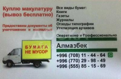 Куплю любую бумагу. Дорого. оперативный вывоз. Профессиональное отношение с клиентами. Приедем за 1 час по Бишкеку. Цена дороже чем у всех остальных. Сами грузим и вывозим без вашего участия. Гарантируем конфиденциальность, оформим документально. Фирмам и организациям предоставим накладные и акты по уничтожению. Наш опыт работы более 3 лет в Бишкеке. У нас имеется бартер на туалетную бумагу по желанию клиента.