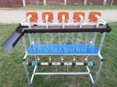 Каждый аппарат жестко не закреплен в стойке и собран на быстросъёмных соединителях, что позволяет, в случае необходимости, перемещать при загрузке колбы с икрой, либо при выклеве личинок. Это полезно при случаях, когда в одной из колб начало наблюдаться какое нибудь заболевание, благодаря нашей конструкции такую колбу с содержащейся в ней икрой и водой легко можно будет убрать и поставить на карантин в другую стойку, а на её место быстро установить новую.