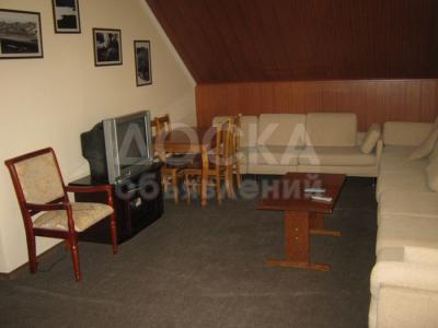 Зал: большой угловой диван, журнальный столик, обеденный стол, 6 стульев, телевизор.