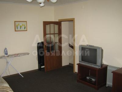 Зал: большой угловой диван, журнальный столик, стенка, телевизор (спутниковое TV), кухонный гарнитур, обеденный стол