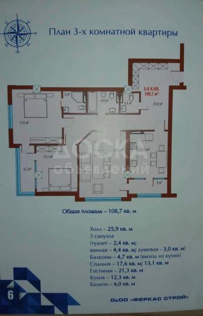 Продаю квартиру 3-ком., 109кв. м., этаж - 10/10, Боконбаева.