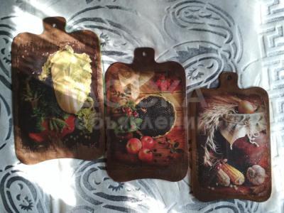 Стильные деревянные разделочные доски отличный подарок любой хозяйке. Одна сторона декорирована под ваш вкус, вторая пригодна для разделывания. Также может служить эксклюзивным украшением вашей кухни. Дерево - береза
