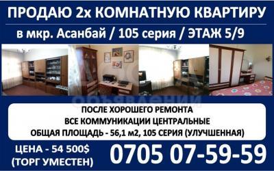 Продаю квартиру 2-ком., 56кв. м., этаж - 5/9, г. Бишкек, мкр. Асанбай (р-он «Жаннат»).