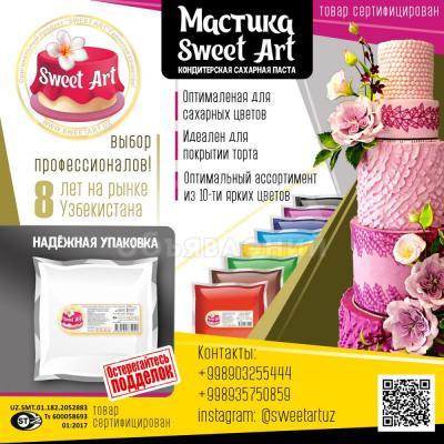 Наша компания "Sweet Art Uzbekistan" с 2010 года на рынке Узбекистана занимается производством сахарного марципана (мастика) для декора тортов и прочно зарекомендовала себя среди профессиональных кондитеров. В своем производстве мы используем высококачественное сырье, сбалансированная и проверенная временем рецептура нашего марципана является универсальным материалом как для покрытия тортов так и изготовления тонких, изящных сахарных цветов и фигурок любой сложности.