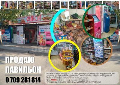 Павильон с общей площадью 42 кв. метра, действующий, с товаром, с оборудованием, кондиционер, два терминала. Оборудование: 3 морозильника, 3 витринных холодильника.